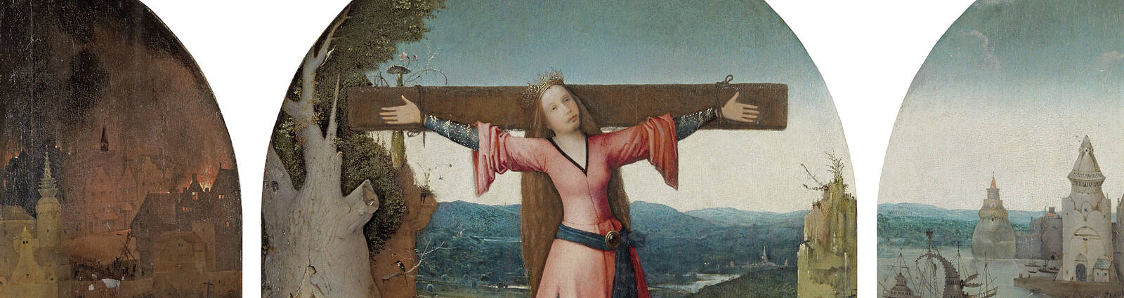 Nicht zuletzt die 2016 abgeschlossene Restaurierung hatte die These gestützt, dass es sich bei Hieronymus Boschs venezianischem Triptychon um die Darstellung einer Wilgefortis oder Sancta Liberata handle, einer vielerorts verehrten, zum Christentum konvertierten Königstochter, die sich ihrer Zwangsverheiratung entziehen konnte und daher das Martyrium der Kreuzigung erleiden musste. Der Legende nach hatte ihr die Anrufung Gottes über Nacht einen Oberlippenbart beschert, eine rettende Mimikry an die männliche Gewalt, die den Bräutigam derart in Schrecken versetzte, dass dieser sich außer Stande sah, die beschlossene Hochzeit auch zu vollziehen. Die Mitteltafel zeigt in heller Aufregung sowohl die vom heidnischen Vater angeordnete Bestrafung als auch die Ohnmacht des Junggesellen ob einer solch schamlosen imitatio christi.