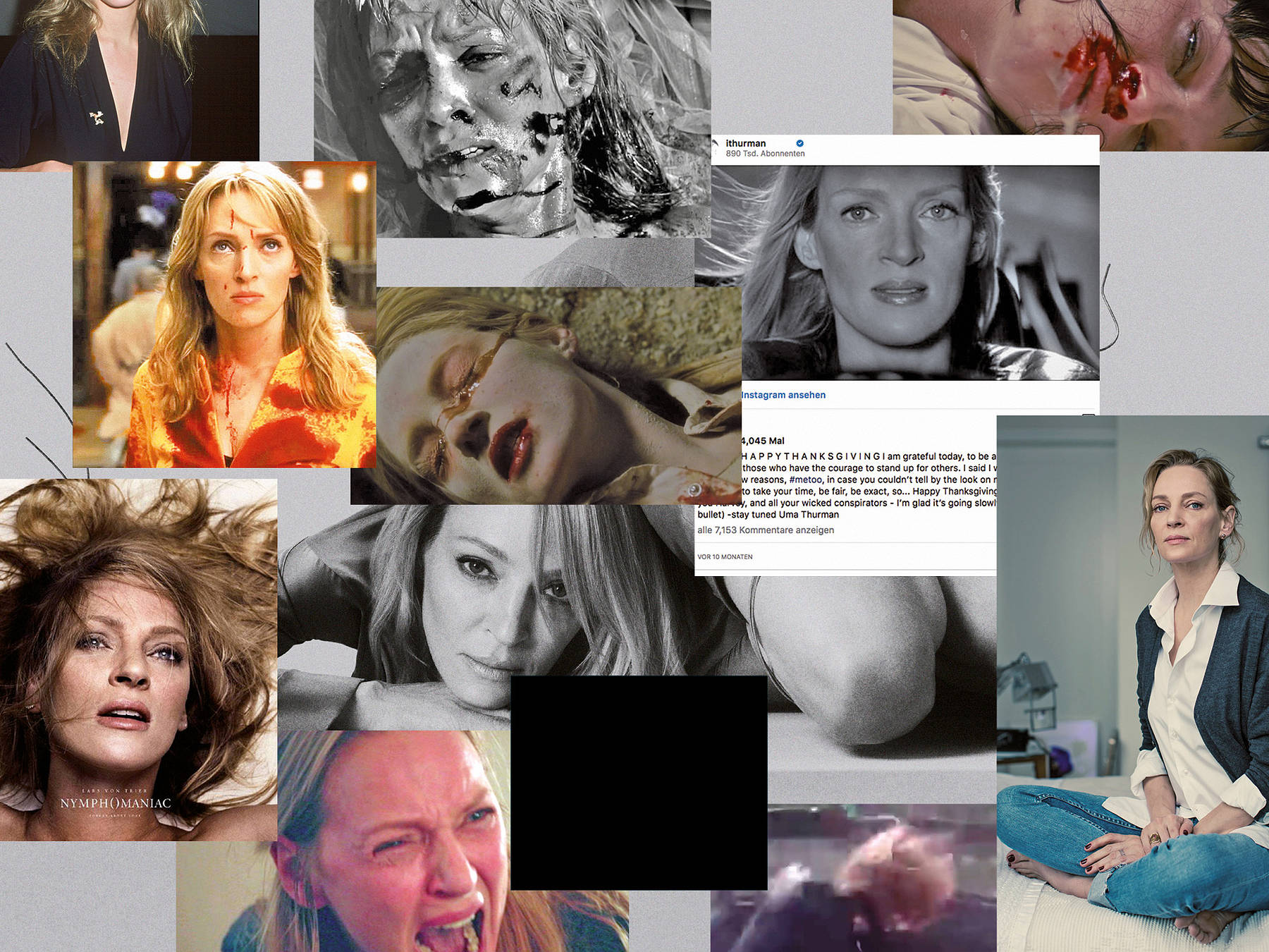 Die lange Latenzzeit, die der Anklage in der NYT – die auch eine Beichte über ihr eigenes Schweigen ist – voranging, kommt aber schon zuvor an ihr Ende: 2012 findet Thurman, gerade erneut Mutter geworden, in Lars von Triers Nymphomaniac in fast therapeutischer Weise eine Stimme für ihre jahrelang aufgestaute Wut: Als Gossip vom Set liest sich das dann so: »Uma Thurman was happy to scream like an animal ›50 times‹ for director Lars von Trier.« Dass der vor allem männliche Blick auf das Gesicht nun in einer beeindruckenden Szene, einem Film im Film, wie Thurman treffend bemerkt, an Verzweiflungsschreien zerschellt, ist dieser neuen filmischen Liaison zu verdanken. Es erscheint nun zugleich verletzlich und souverän im Schmerz. Thurmans Rolle der Mrs H, ihre Performance als verlassene Ehefrau, Mutter dreier Söhne, ist emotional vielschichtig und setzt den von Trier moralisch präzis kalkulierten Kontrapunkt zum kalten sexsüchtigen Leiden der Gainsbourg in eindrücklicher Weise ins Bild und auf die Tonspur.